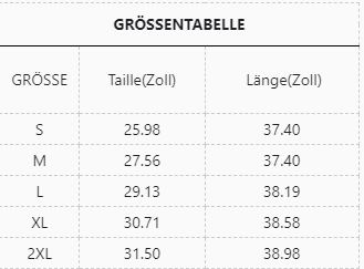 | GRÖSSE | Taille(Zoll) | Länge(Zoll) |
