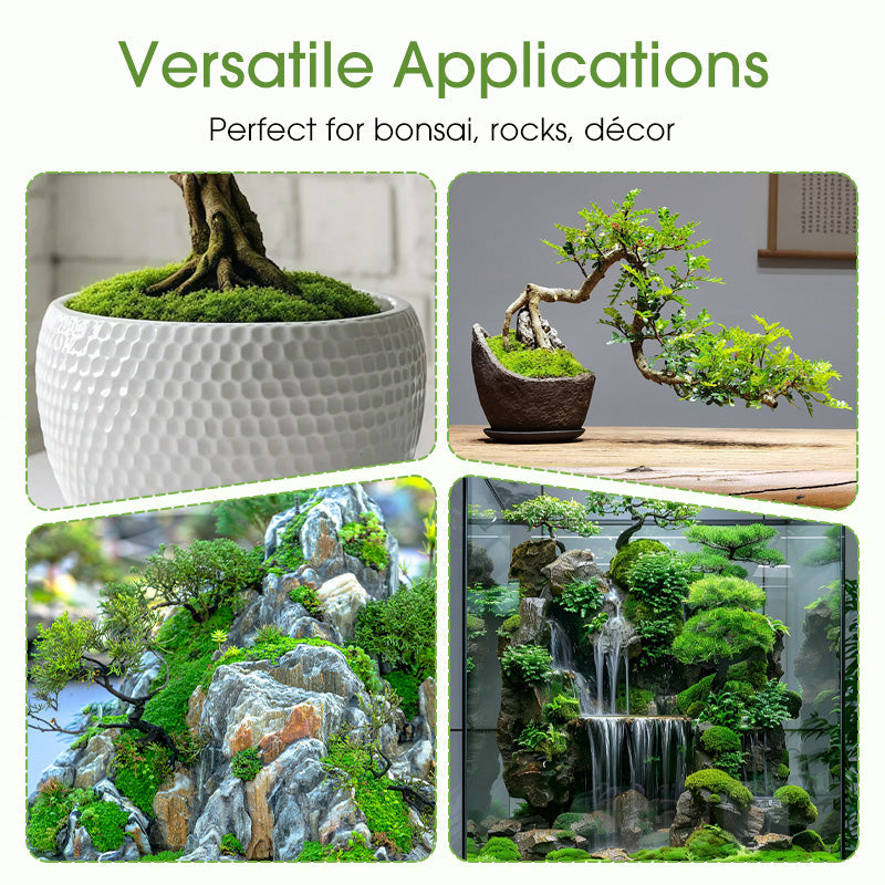 VIELSEITIGE LANDSCHAFTSVERWENDUNG – Ideal für Topfpflanzen, Steingärten, Bonsai-Untergründe oder kleine Zierszenen. Es verbessert Textur, Tiefe und natürliche Ästhetik in privaten und professionellen Umgebungen. Eine kleine Menge bedeckt eine große Fläche und verleiht Ihren Räumen einen friedlichen, moosbedeckten Charme.