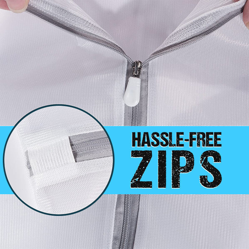 Glatter Reißverschluss für einfachen Zugang zur Wäsche. Der Reißverschluss kann während des Gebrauchs in die Schutzlasche gesteckt werden, um ein Hängenbleiben und Kratzen an der Kleidung zu verhindern. Verhindert das Öffnen des Beutels während des Waschens und Trocknens. Sie erleben ein neues, reibungsloses Waschvergnügen.